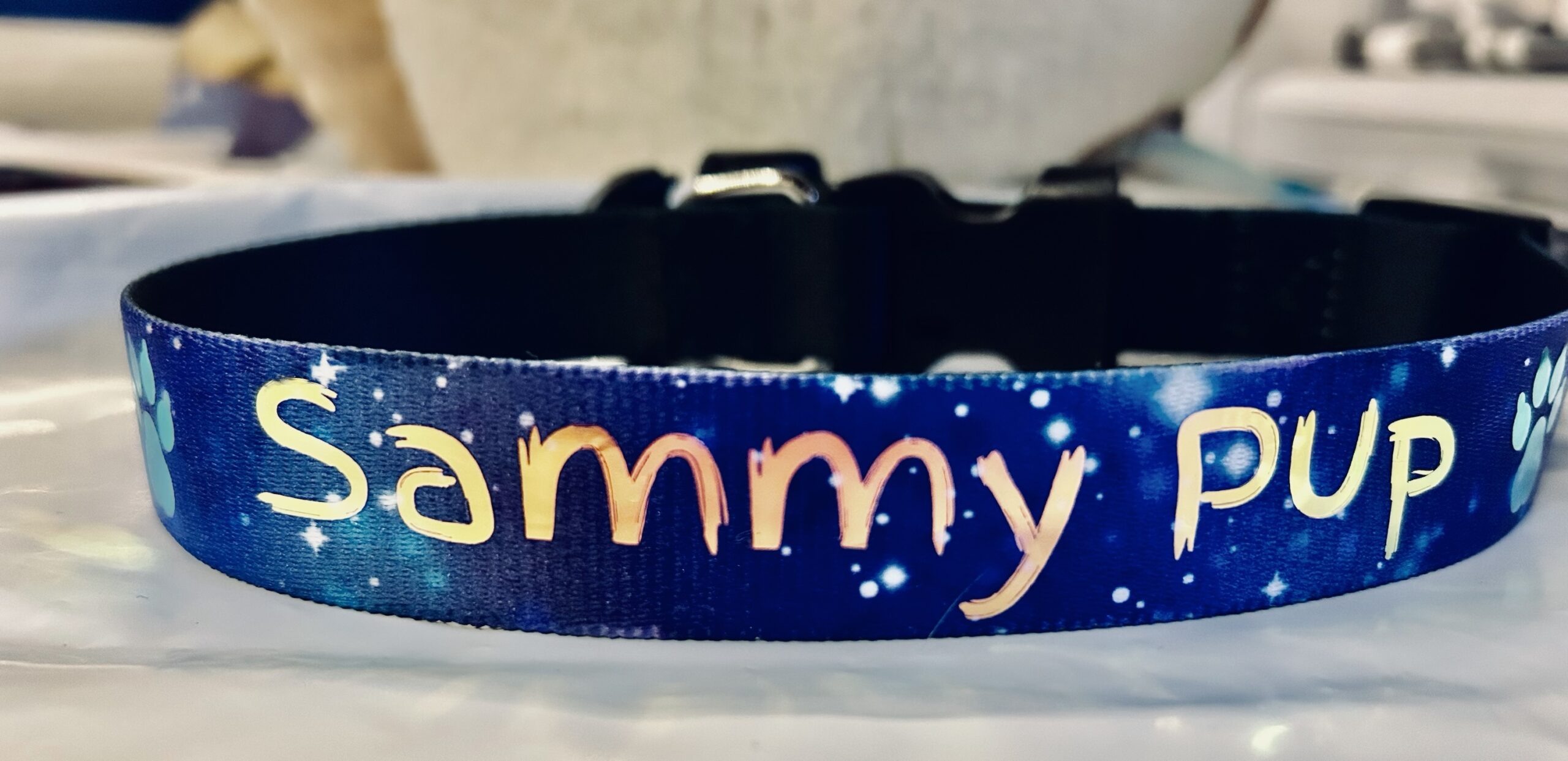 A sublimated nylon blend collar, personalised with your character name and small details like a paw print if requested.